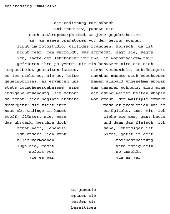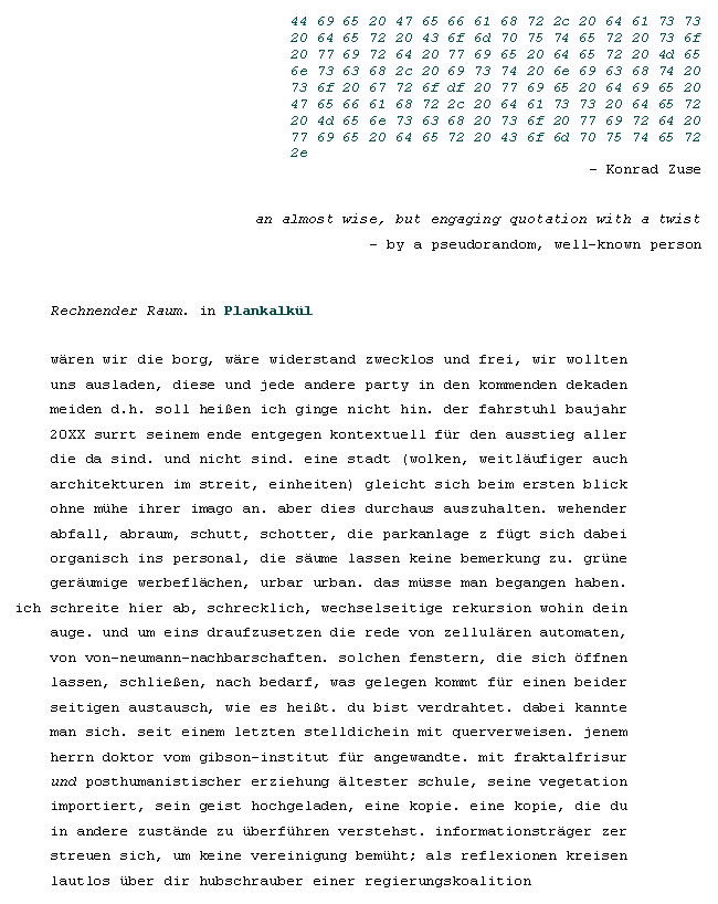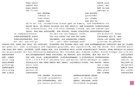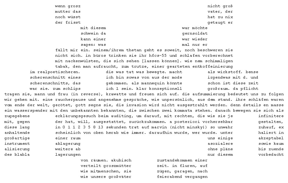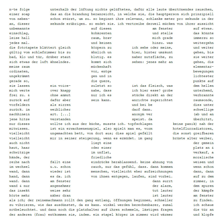 »Es gibt für mich einigen Grund, hier zu beginnen. Es waren wohl Dinge, es gab wohl Dinge, die mich auf den Weg brachten; ich folge ihnen, aber erst, seit sie hinter mir liegen, ist es überhaupt von Bedeutung, dass sie da sind, ich verliere sie aus dem Blick. Nichts davon berührt mich. Meine Augen müssten geschlossen sein, alles schläft, und vor meinen Augen spüre ich den Raum. Ich darf sie nicht berühren, mein Blick darf sie nicht sehen, mein Atem fehlt. Mein Blick also, mein Atem, dort im Raum. Der Raum ist mir zugewandt. Ich muss andere Schritte finden, einen neuen Gang.«