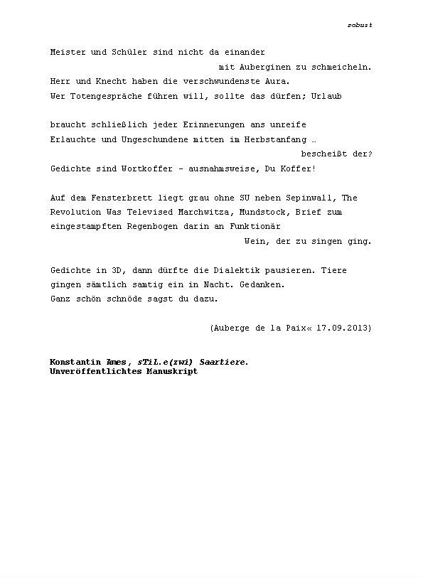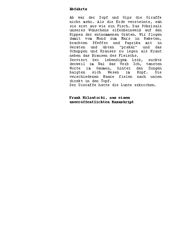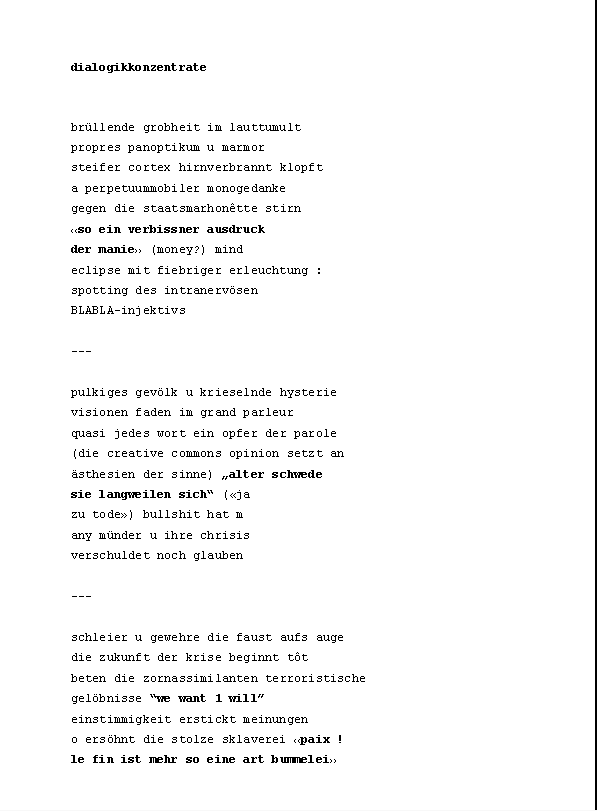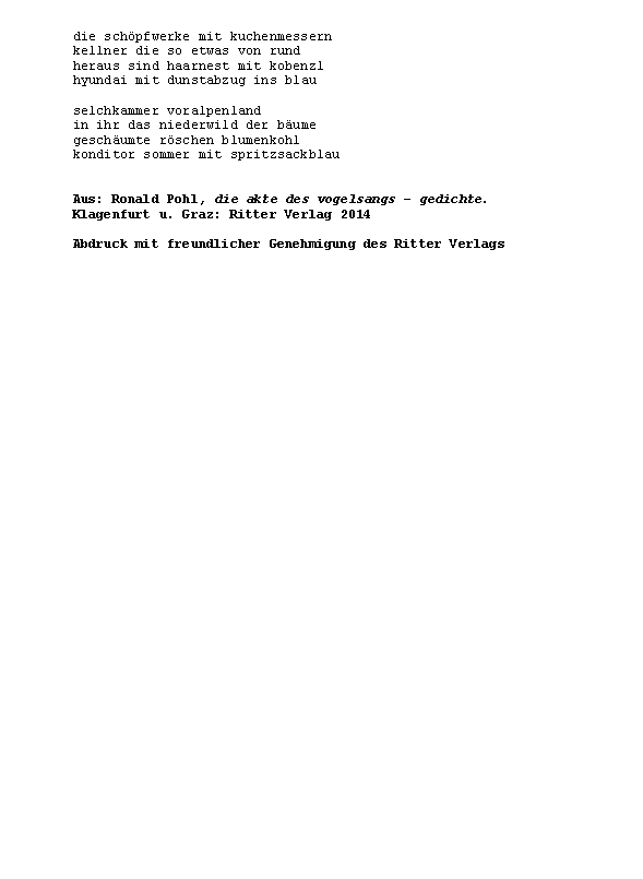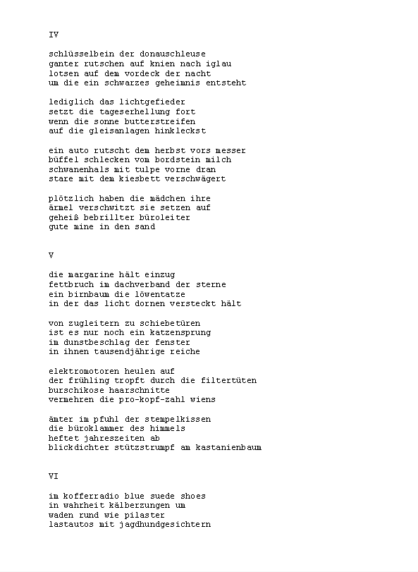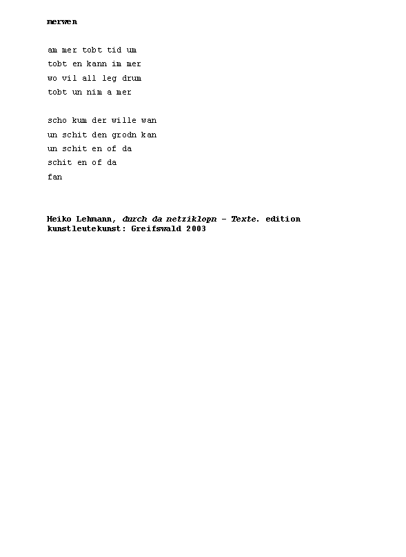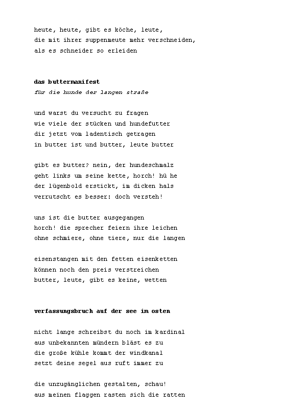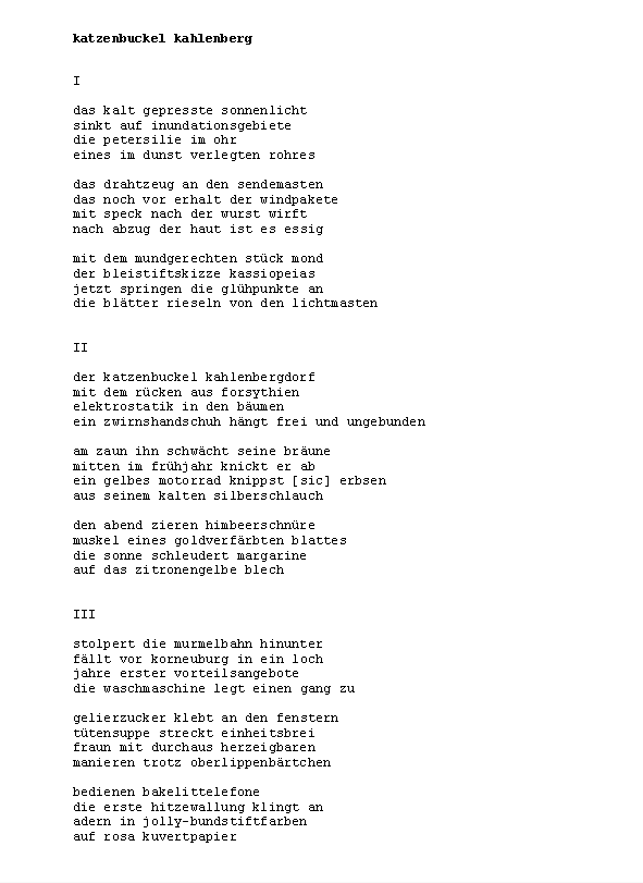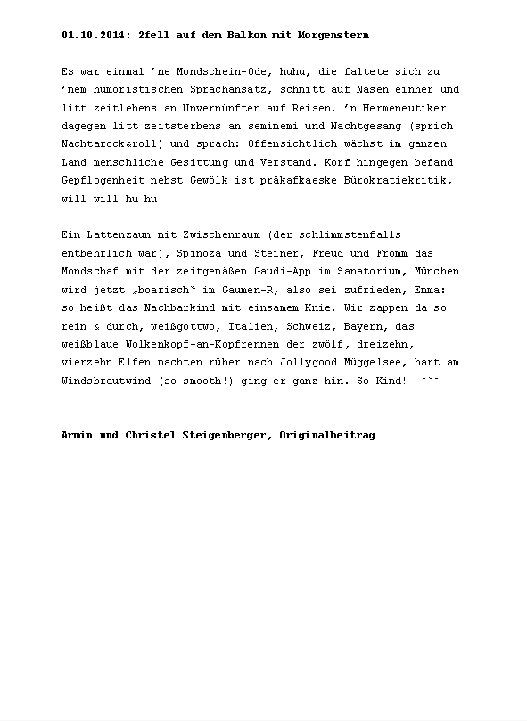 »ÄsthetIn Kuhlnis verlässt Terrasse um Terrasse, und hält erst mitten aufm Meer neben Captain Morgensterns Üboot inne (innen). Ein Jahreskontext der Genitivmetwaffe zur Eindämmung postmoderner Albernheit süffisanten Lehms.« Zusammengestellt von Konstantin Ames und präsentiert von Norbert Lange.