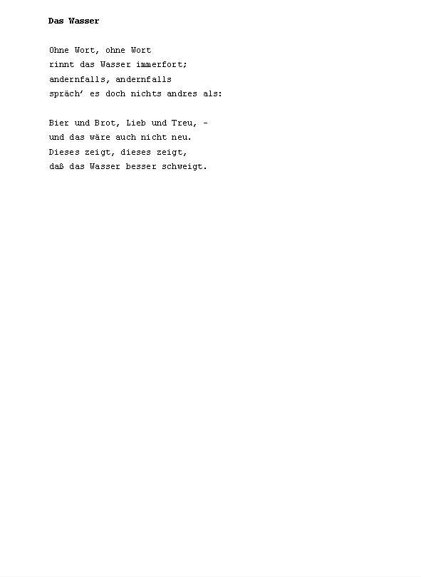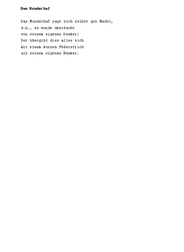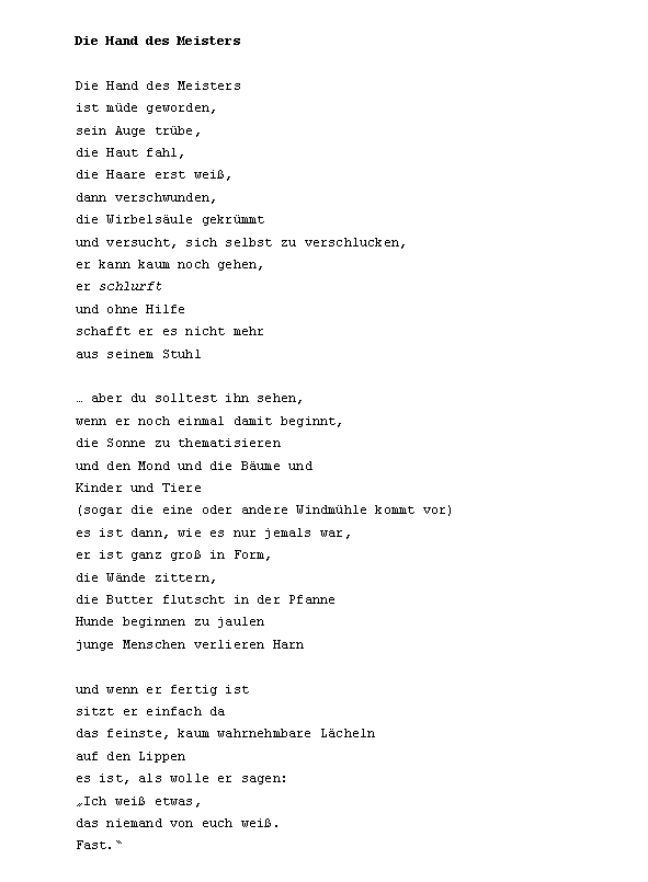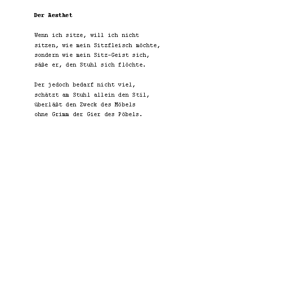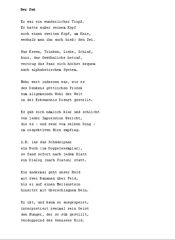 die der xe und das xf x mit es im ein in den auf ist u xdf noch zu dem des sich er aus an ich sie wenn Christian Morgenstern: Der Aesthet wie so von als m nicht n s um b f nach r da du knie nur xbb am ohne w was wei dann h l mehr vom war wasser winde xdft butter eine einen geht k man mich nichts sein seinem will zum auch d durch ganz kein mir ms o originalbeitrag sch sind Frank Milautzcki: Abfährts sonst st t unver wir auge bl br chte doch einem einmal erde geist gibt ihn ihre jetzt kind kopf mein re schatten setzt sitzt sonne welt wer wort zur zwei ab bis de dir en ffentlichten gedichte geh haben hand hat hie ihr ins kann kaum komm lk mer mond Christian Morgenstern: Der Schaukelstuhl auf der verlassenen Terrasse mondschaf nacht oder ort pro rinnt rund sagt seine selbst stuhl tiere tobt vor wackel wass wo xdfe xfcber xfcrs zwi a ach allein alles alte andere anderen andernfalls ans aufs aug baum beginnt bels besser che chst chw darin dein deine deiner denn dieses dreht eigenen einander eines einhorn einsam ers erst erstickt etwas euch ffentlichtes fort fr fresse fri g ganze ganzen gaumen gegen gehen gespenst gew ging greul gro haare hatte haut hei heute horch hu hunde i ihnen immer jeder jedes kapit koffer kommt korf kraut la le lehmann leute licht liegen liegt litt lt mal mann margarine meisters menschen mitten mundgerechten nde neben niemand nnen of ohr p quelle ren ritter rtchen ruft schaukelstuhl Johannes Witek: Die Hand des Meisters schon schw sehn sei selben selber sitzen sterben stil tag teile ten terrasse texte tr uft ume unschit versucht walfafisch ward wird wohl xaf xd xdfer xfc xfcck xfccken xfchle xfchren z zeigt zelt zittern zukunft abdruck abend abendstund aber abf abschnitt absolusioniertefonds absonderlich abzug academicbagagecachiert acht adern aesthet akt akte algorhythmus all allgemeinen alphabetischem also alten alter ames amourirefouavectoim and andermal andres angefixt anker antiken anym apokryptik app armin artbummelei artig au auberge auberginen augenblick aura ausgegangen ausgegorene ausgespeist ausnahmsweise auto bakelittelefone balgten balkon bananen bayern be bebrillter bedarf bedienen befand beginnen begleitet bei bein beinchen bequem bericht beschallen beschei beste beten betrachtet betraf bett beute bier bild bin bioethisch birnbaum blabla blatt Christian Morgenstern: Der Walfisch blattes blau blech bleibt bleistiftskizzekassiopeias blickdichter blieb blumenkohl bnisse boarisch bojen bordstein brachtenpfeffer braucht brausen brechung brennendes bricht brief bringen broadcasting brot bruder buch bullshit bundstiftfarben bunsen bunte burschikose buster buttermanifest butterstreifen ch cheese cheln Konstantin Ames: Meister und Schüler sind ... chen chirurgen chrisis christel chromosomengedopten cht cineol cke clublaser code colt commons container cortex cosmetics creation creative dachverband dagegen damit damitvom dass dazu dchen delpaar demiurgen denkens denker denkt derweilim dialektik dialog dialogikkonzentrate dich dicken dienst dies ding direkt dogma donauschleuse doppelexemplar dorf dornen dr drahtzeug dran dreizehn druck drum dunst dunstabzug dunstbeschlag durchaus duzt dynamische dysfunktionen e eben eclipse eden editionkunstleutekunst edukte ehrlichkeit eiche eignen eilige einbetonierten einfach eingestampften einheitsbrei einher einsamem einsamer einstimmigkeit einzug eisenketten eisenstangen elektromotoren elektrostatik elfen elfenbeinwei emma empfing ende enimyliert entbehrlich entnommenen entsteht erbsen eren erhalt erhalten erinnerungen erkenntnis erkrochen erlauchte erleiden erleuchtung ersauf erschossen erste erster erzogenen essen essig eul eule euren evolutiondesign ewigen exegenese exkommunizierten extra fabian facilitetten faden fahl falten faltete fan fand farbe fast faust federstrich fegefeuer fehlern feiern feinste feld fell fellner fenster fensterbrett fenstern ferkleerunk fernverkehr fertig fett fettbruch fetten fiebriger fielen filter filtert fin fisch fissifra fitsch fl flaggen fleischs flennen fliehkraft flieht flitzt flogen flut flutscht fordert form forsythien frage fragen frank frau fraun frei fremde frequenzen freud freundlicher fromm ft fuhr fuhrst funktion gab gang ganter gar gaudi geberde gebissen geburtstagsretorten gecrashteroverload gedanken Christian Morgenstern: Gespenst gegenwart gegipst gehe gehei geheimnis gehn geklungen gekr gel gelbes geleckt gelierzucker gen genehmigung gens genusses georg gepflogenheit gepimpten gepresste ger gert gesch geschn geschw gesetz gesittung gestalten gestellt gestillt gesund getragen gewehre gewinnt geworden gier gieraffe gingen gips giraffe gl glanzpatron glauben glaubt gleisanlagen glich glossolallie goldnen goldverf googleorakels gospels gott gr grad gram grammatischen grandparleur grapstain gras grau graz greatcivil greifswald greifswaldsonette grimm grobe grobheit grodnkan gut gute haar haarnest haarschnitte hafen hallof hals hammer harn hart hau hausfrau he heftet heiko heiligtum heimat held hele henker her heraus herbst herbstanfang hermeneutiker herr herrzylinder herzeigbaren heulen hilfe himbeerschn himmels hin hinaus hinein Ronald Pohl: katzenbuckelkahlenberg hingegen hinkleckst hinsitzt hinter hinunter hirn hirnverbrannt hitzewallung hner hnliche hnt hotels hrend hricht hrige hrt hrts huhu humoristischen hundefutter hundeleine hundeschmalz hunger hut hyperpneumatischerrwortventilation hyundai ichs icht ichtungen idee idyllenkompost iglau ihm ihrem ihrer ihres ii iii immerfort impression indessen injektivs interpretiert intranerv inundationsgebiete irrt italien iv jagdhundgesichtern jahr jahre jahreszeiten jaulen jedem jedenfalls jedoch jemals jenes johannes jolly jollygood junge kafkaeske kalt kalten kardamomum kardinal Christian Morgenstern: Das Einhorn karin kastanienbaum katzenbuckelkahlenberg katzenbuckelkahlenbergdorf katzensprung kehrst keine kellner kelsalz kenne kette kiesbett kinder kinn klagenfurt klar klatten klebt klingt klopft knecht knickt knien knippst kobenzl