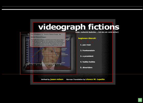 Pac-Man, Frankenstein, Ronald Reagan, die Dinoriders und Hubba Bubba werden, geflankt von Videos und in Graphen gesetzt, zu ganz anderen Erzählungen, so witzig wie gebrochen. Ein interaktives Computergedicht zum Spielenlesen von Jason Nelson.