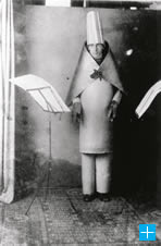 Diese Sehnsucht nach dem absoluten Wort, die sich in der Person Balls in zwei unterschiedlichen Ausprägungen manifestiert, spiegelt sich in dem berühmten Bild aus dem Jahr 1916, das Ball beim Rezitieren von »Karawane« zeigt: Ball trägt ein kubistisches Kostüm, das einerseits auf reine, abstrakte Formen reduziert sein will und mit der Bedeutungslosigkeit der Worte korrespondiert; andererseits erinnert das Kostüm an ein liturgisches Gewand. Ich irre mich sicher nicht, wenn ich sage, dass man die Rolle auf Balls Kopf auf den ersten Blick nicht als eine bedeutungslose Rolle, sondern als eine Art Mitra betrachtet.